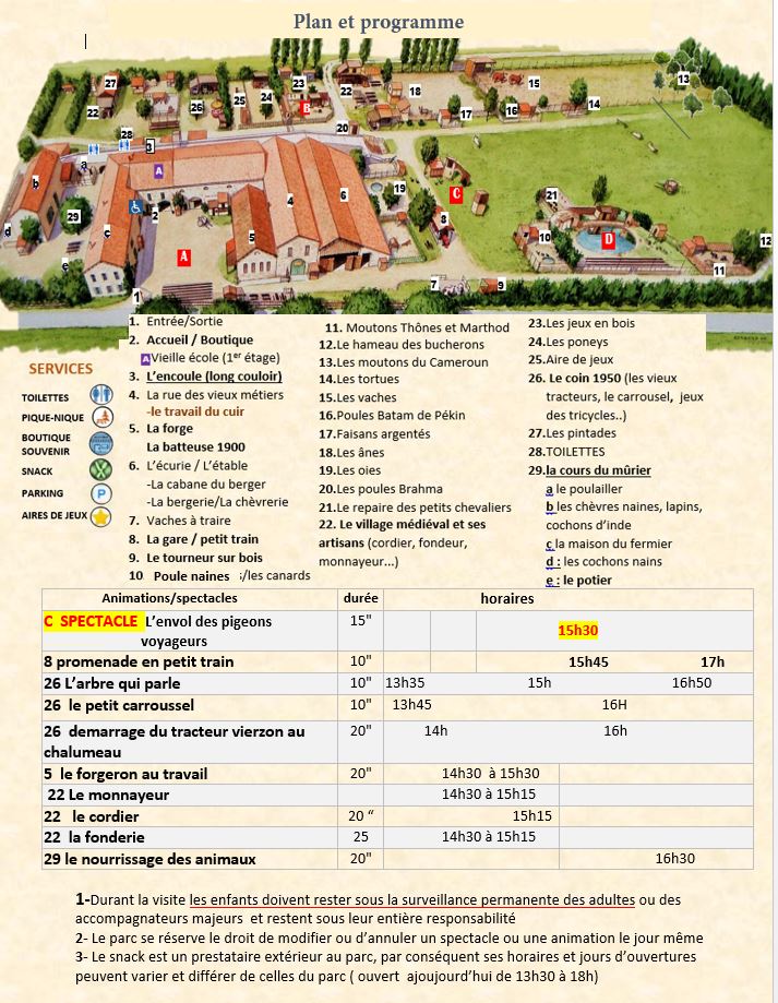 Les incontournables seront aussi au rendez vous avec le forgeron, l’atelier corde, la mise en route du tracteur Vierzon au chalumeau, le nourrissage des animaux, la promenade en petit train et l’envol des pigeons voyageurs…