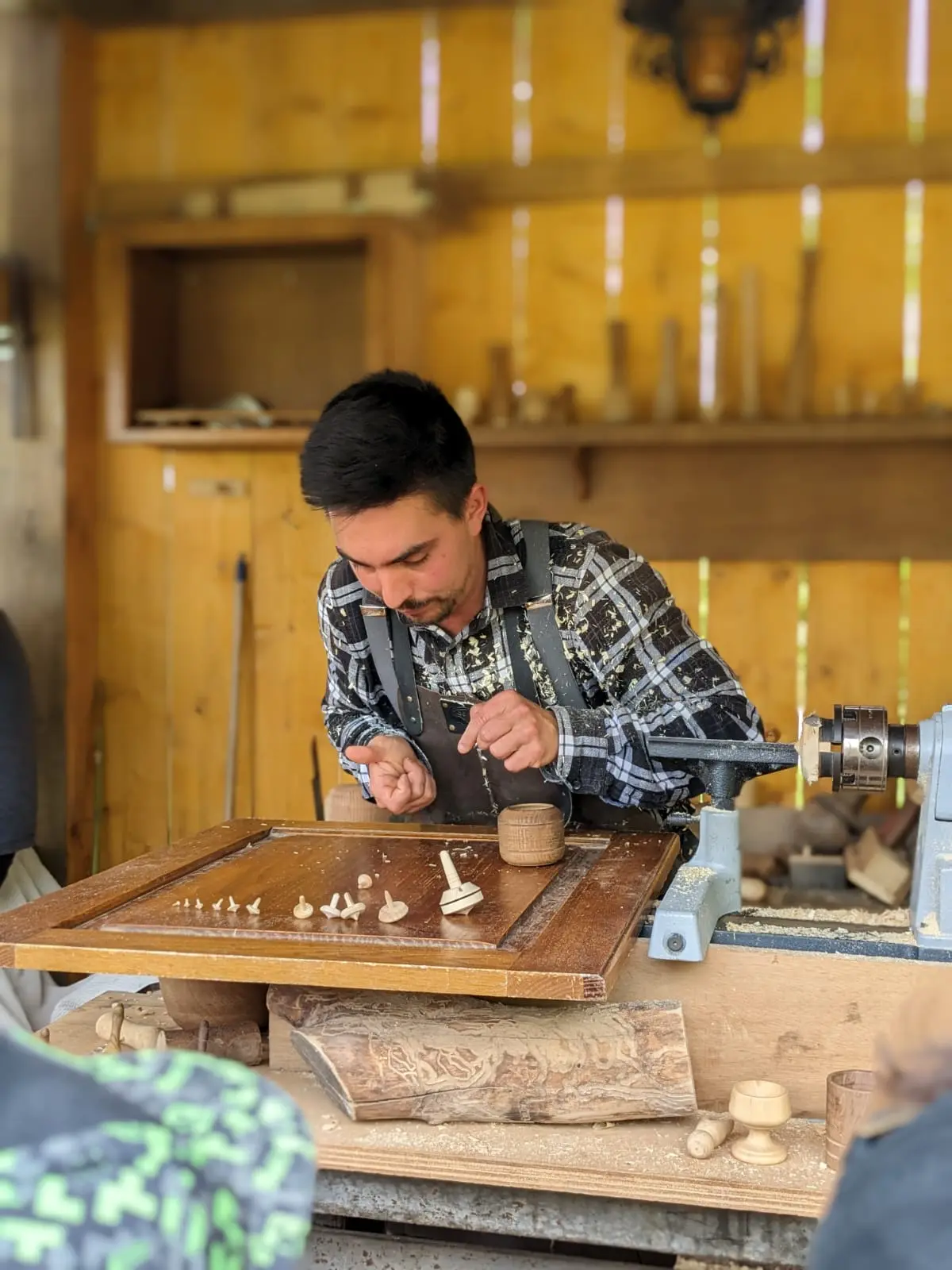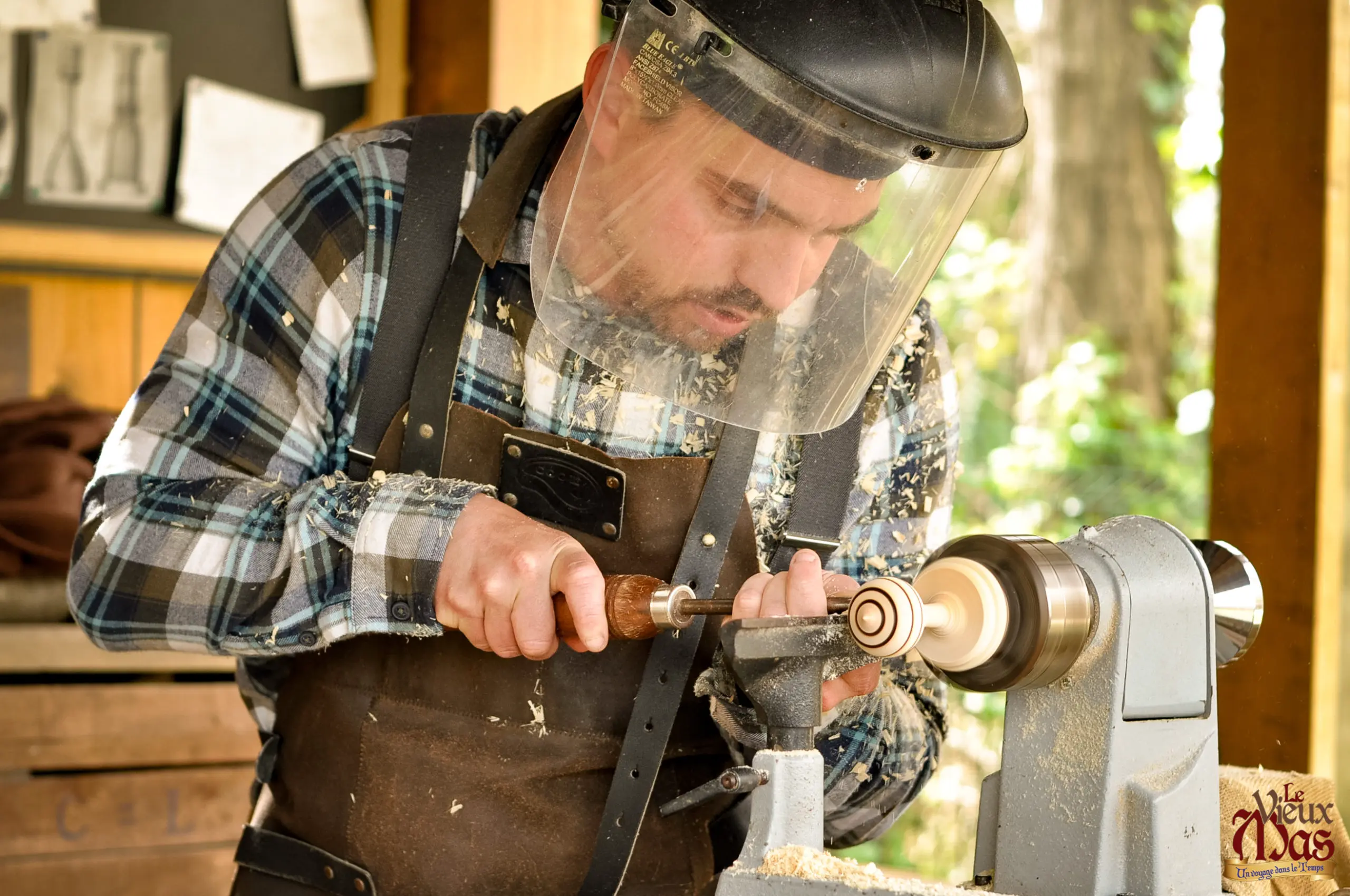 Avec des gestes précis, Sous ses couteaux, gouges, bédanes, racloirs, le bois reprend vie et se transforme en toupie pour le plus grand bonheur des enfants.Assiettes, verres et couverts étaient autrefois tournés par ses mains et vendus dans les campagnes grâce aux colporteurs……