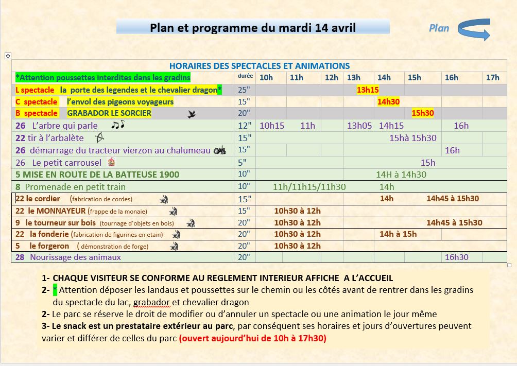 De animaties worden gepresenteerd in het weekend, tijdens vakanties en op feestdagen van 10:30 tot 12:00 en van 13:15 tot 17:00.